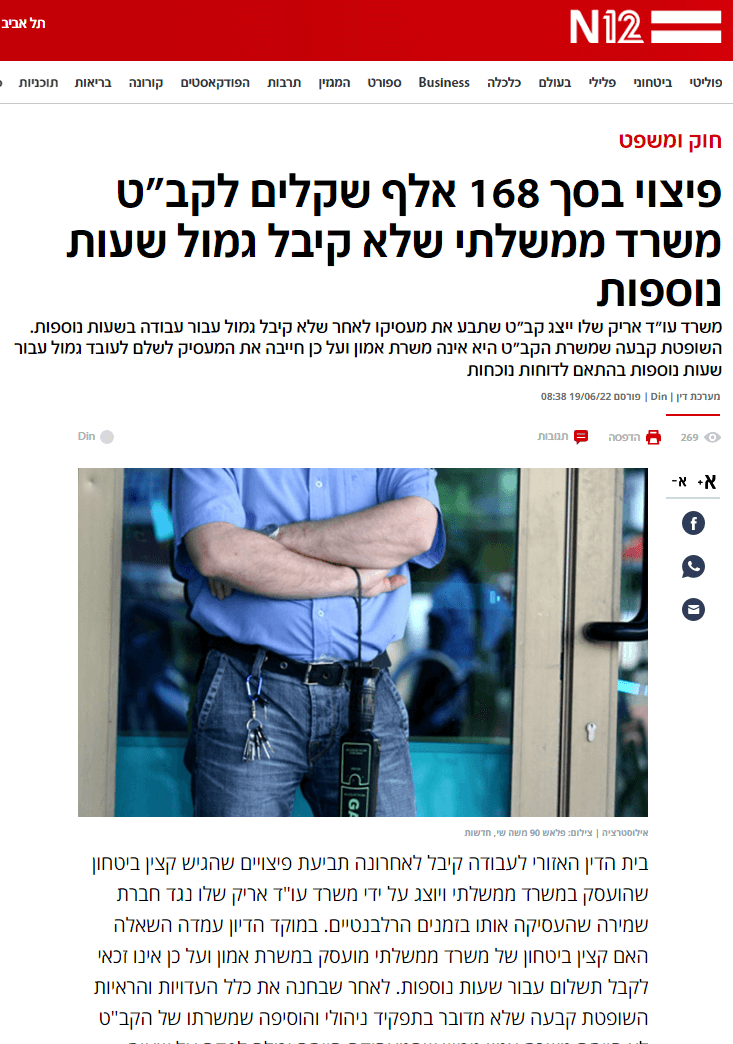 לפרטים נוספות אודות זכויות בענף האבטחה ניתן ליצור קשר עם משרדנו, אשר מייעץ ומייצג לקוחות מעל לשני עשורים, כמו גם זכה בדירוג BDI כאחד ממשרדי עריכת הדין המומלצים.